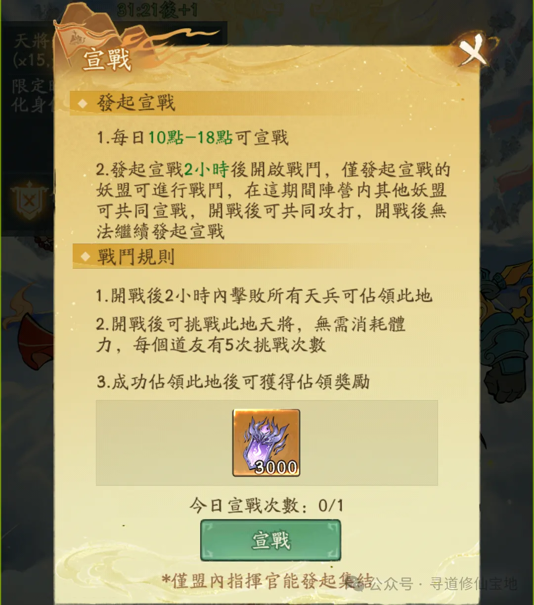 ·限时战格需要阵营内早上10点宣战,12点开打,14点前没打完就会重置,开启以后可以把高战划分为20个人去打高战怪,低战划分为100人去打低战怪。